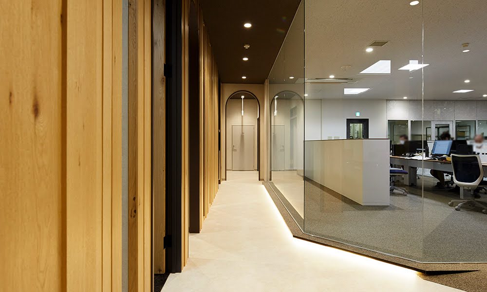 株式会社花の大和様から事務所改装のご相談をいただき、約1年半かけて来客エリアと執務エリアの計画を進めました。エントランスと執務スペースの間には全面ガラスの間仕切りを採用し、働く様子がさりげなく伝わる開放的な構成としています。