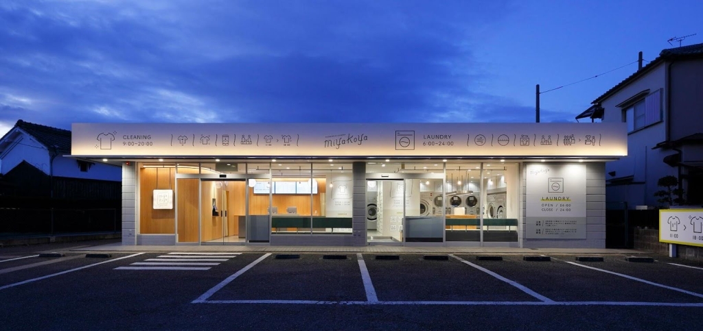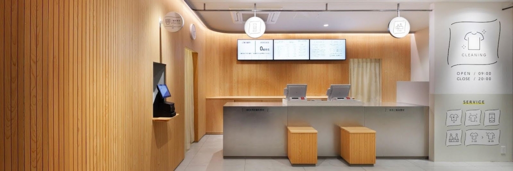 店内には熊野産の桧を用いた羽目板を随所に採用し、清潔感と木の香りが感じられる柔らかな雰囲気を演出しました。また、カラフルだったランドリー機器はステンレス調シートで統一感を持たせ、外観は洗濯物が風に揺れる情景を想起させるデザインと、愛らしいロゴやピクトで印象深いファサードに仕上げています。