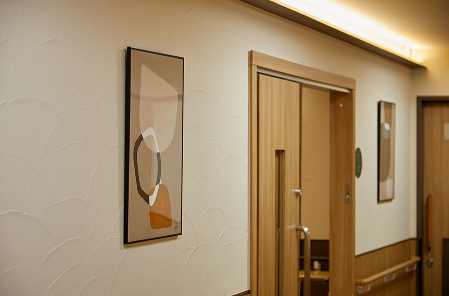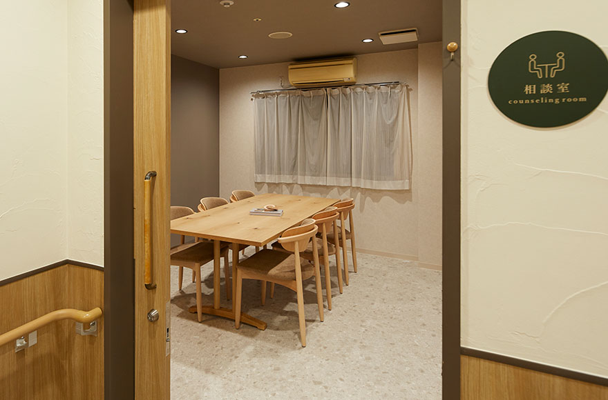 風除室の壁面に使用したタイルや装飾のアート、相談室の内装仕上げや家具・小物なども、それぞれの空間に応じた雰囲気づくりを考え、計画を進めてきました。