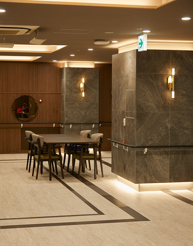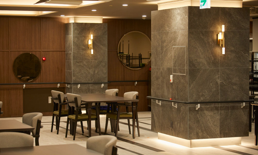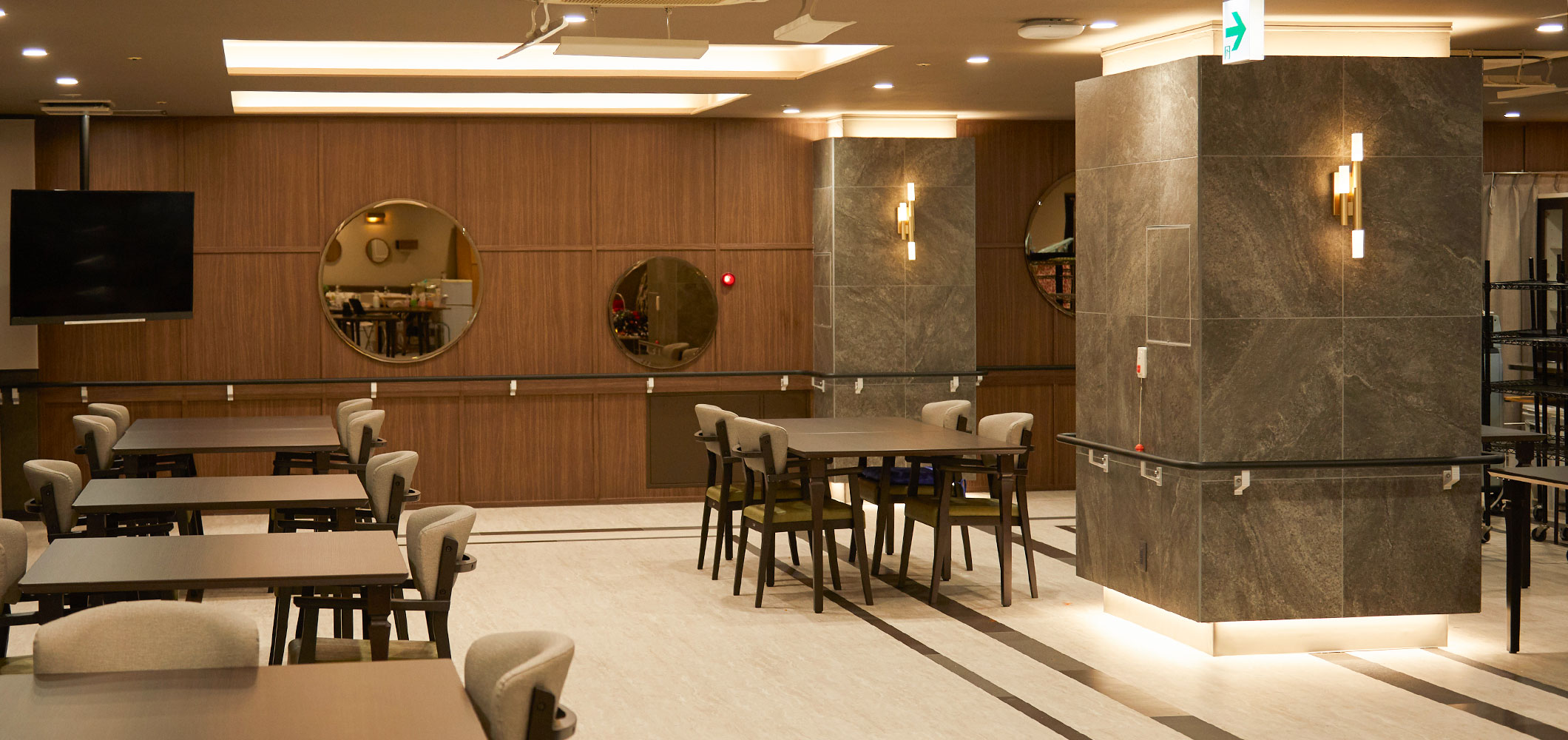 今回は大阪府堺市にある有料老人ホームスーパー・コート プライム神石さまにおいて、食堂や風除室等の改装工事をさせていただきました。