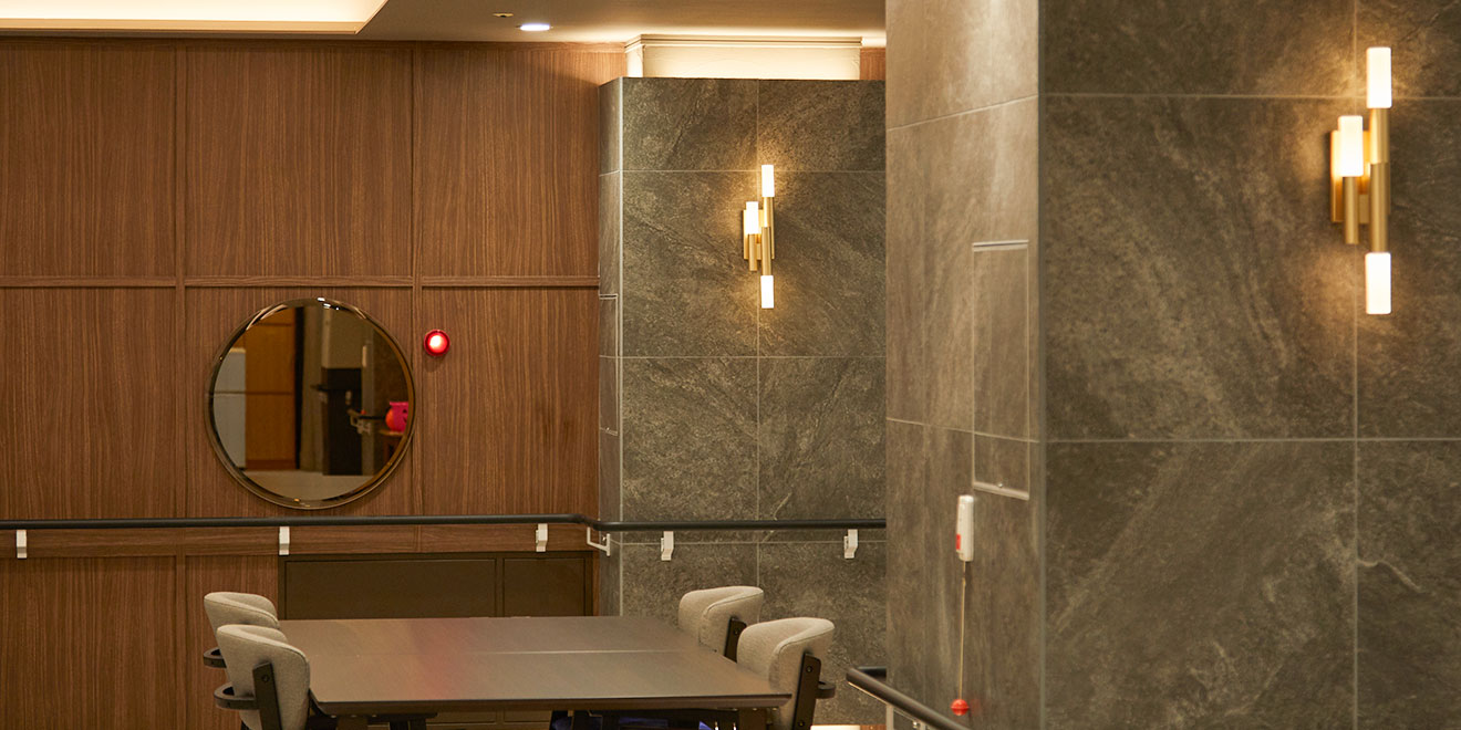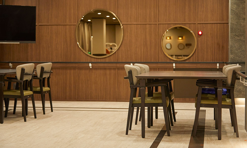 家具については、いわゆる”介護施設用家具”というイメージのものではなく、デザイン性と機能性を兼ね備えたものを選定することで、食堂全体の印象がこれまでとはガラッと変わったかと思います。