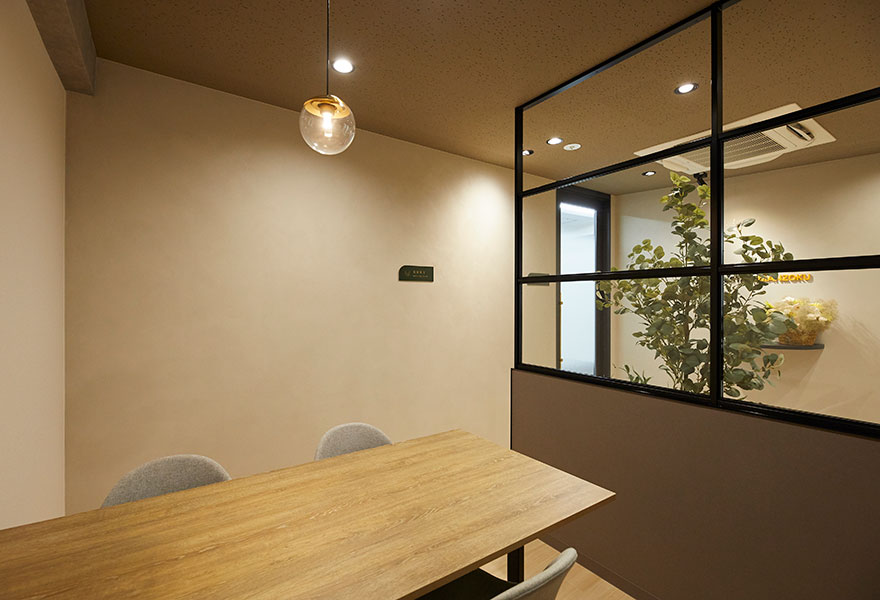 限られたスペースながらも、閉鎖的にならず視線が通るように間仕切りにガラスを取り入れて空間を柔らかく仕切っています。