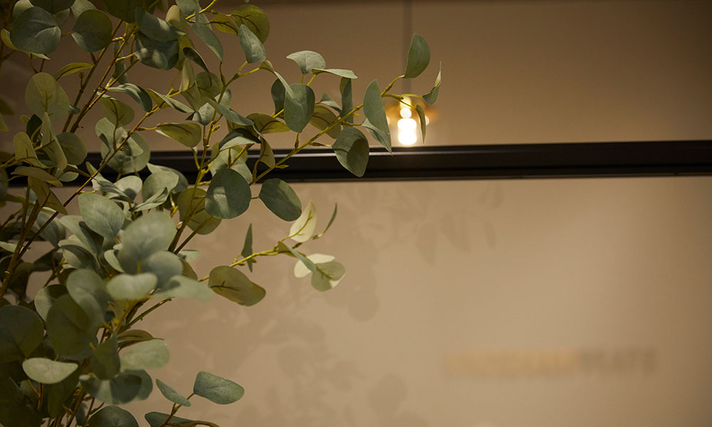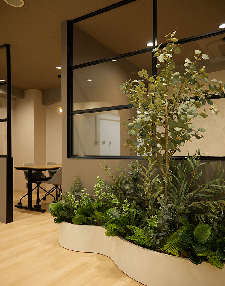 さらに、ポイントに取り入れたガラスのコーナー部分のアールや、フェイクグリーンが、空間にカジュアルさを加えてくれています。