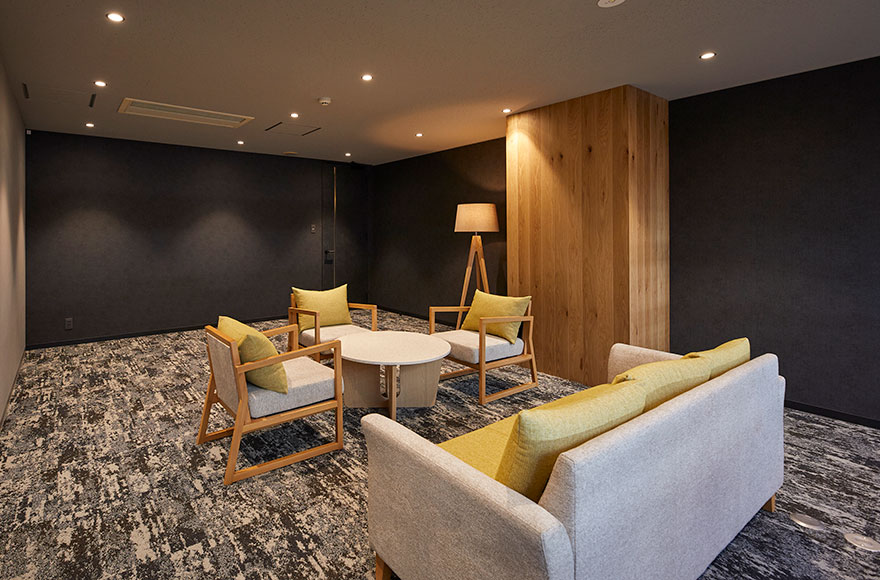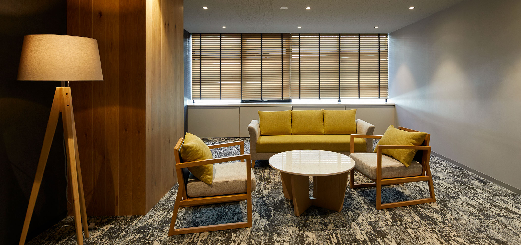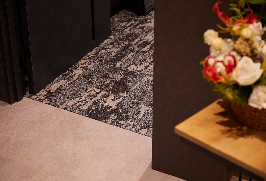 応接室に使用したタイルカーペットは、一見したところ柄の印象が強く感じられますが、シンプルなエントランスとの対比に大きな役割を担ってくれています。