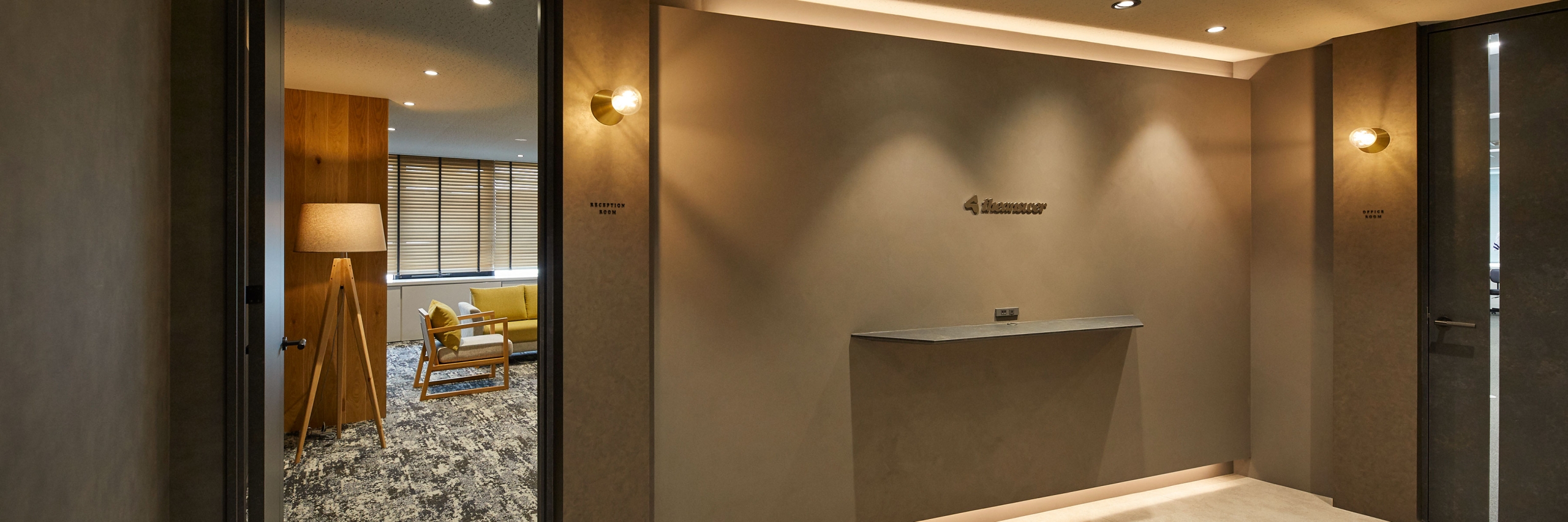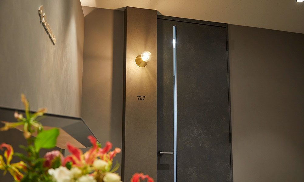 エントランスでは左官塗材としてcoatを使用することで、濃色を全面的に使用しながらも柔らかい印象も添えることができました。